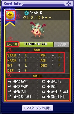 ざっくりかくからわからないことはクラブのやつに聞け 合成したカードが何になるかはtalewiki見ろ 属性UP、属性追撃は必須 後は追撃系を盛る 例:属性UP[任意の属性]、追撃[任意の属性]、夜行性、財力、MP吸収、SP吸収、瞬足、女神 ・(極限後) 追撃系は一枠で上限までいくため追撃系を削る いっそのことなくてもよい 耐久の初撃はダメージ上限がなく極限後はかなり強力 例:属性UP[任意の属性]、追撃[任意の属性]、瞬足、MP吸収、SP吸収、耐久の初撃、女神、初速 ②完成後カードを選ぶ (ランク5) ビックテディ、アレネ、北京ダックウォーリアー (ランク6) ゼリーキング、トゥートゥーキング、ハニーベア、洞窟ダックウォーリアー ③ほしいスキルを持ったモンスターカードを取得 エンピニオンのMP吸収+3など5枠目以降のスキルを覚えるときは要注意 銅カードだと4枠までしかスキルを取得できないためMP吸収+3を覚えない 銀カード以上を引けば覚えるが高ランクだと銀以上を引ける確率が低いため 合成でMP吸収を最初から覚えたエンピニオンを作成する スキルレベルは+でも-でもよい MP吸収の枠をあらかじめ確保しておけば上書きで+3になる ④ほしいスキルを持ったカードのランクを落とす 適当なレベル1のカードとほしいスキルを持ったカードを合成してランクを落としていく レベル1のカードは何でもよいが悪魔系にはならないようにする 一度悪魔になると他の種族に戻しにくくなるため注意 カードの所持枠には上限があるため、1個ずつスキルレベルを落とすのではく先に合成してある程度 スキルをまとめてからレベルを落とすとよい ⑤スキルをまとめる 完成カードの素材になるカードに欲しいスキル8個を固める 各4個ずつのスキルを2枚の合成元カードに固める ⑥完成カードの合成 モンスターカードダンジョンの合成の部屋に入って金カードを引くまで粘る ⑦カードのレベルを上げる カードが完成したらカードのレベルを上げる 経験値を得るとモンスターカードにも経験値がたまる |